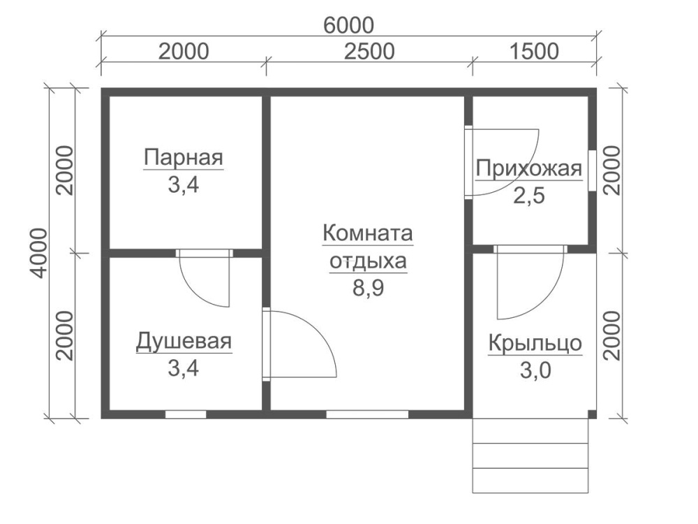 | Двери | Входная- металлическая, утеплённая (Россия). Межкомнатные- филёнчатые. В парную- клиновая (банная). | Отсутствуют. |